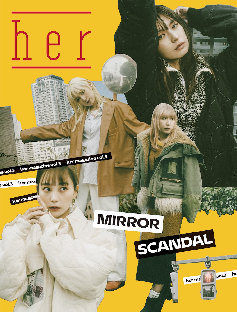 また、アルバム『MIRROR』初回限定盤Bに付属する雑誌『”her” Magazine Vol.3』の内容も発表された。シングル「マスターピース/まばたき」、アルバム『Kiss from the darkness』の初回限定盤にも付属され人気を博した待望の雑誌の最新号は、ここでしか見ることができないメンバーの撮り下ろし写真&アルバムインタビュー、メンバーそれぞれの持ち込みソロ企画ページ、毎回好評の読者プレゼントコーナーなど、盛りだくさんの内容となっている。表紙画像も本日公開となった。