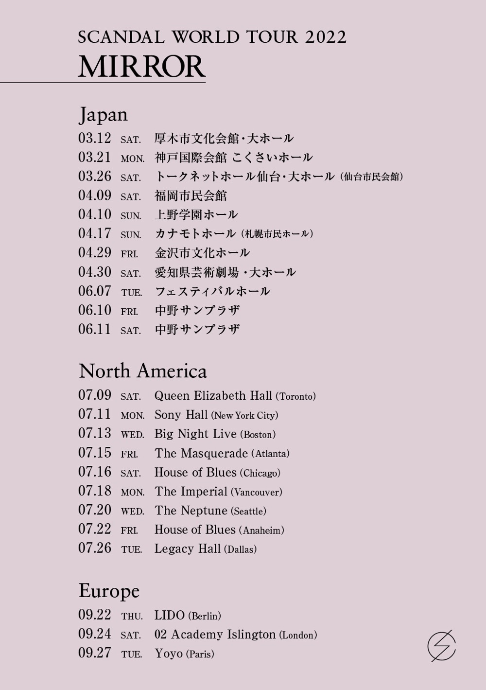 さらに、3月スタートのアルバムを引っ提げたワールドツアー『SCANDAL WORLD TOUR 2022 “MIRROR”』の北米ツアーの追加公演が発表となった。トロント、ニューヨーク、アトランタ、アナハイム、ダラス公演が発表となっていたが、あらたにボストン、シカゴ、バンクーバー、シアトルの4公演が追加となり、北米ツアーとして9公演を行う予定だ。4年ぶりとなる日本国内ホールツアーのチケットも2次オーダーがスタート。ライブでは、アルバムの楽曲はもちろん、結成より15年間の人気曲を含めたセットリストを予定しているとのことだ。