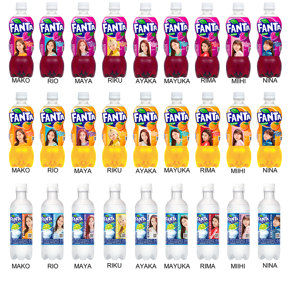 限定デザインボトルが発売されるのは、“ファンタ グレープ”“ファンタ オレンジ”“ファンタ ヨーグルラッシュ”の3種のフレーバー。それぞれのメンバーごとに異なる9種類のデザインが各フレーバーで展開される。