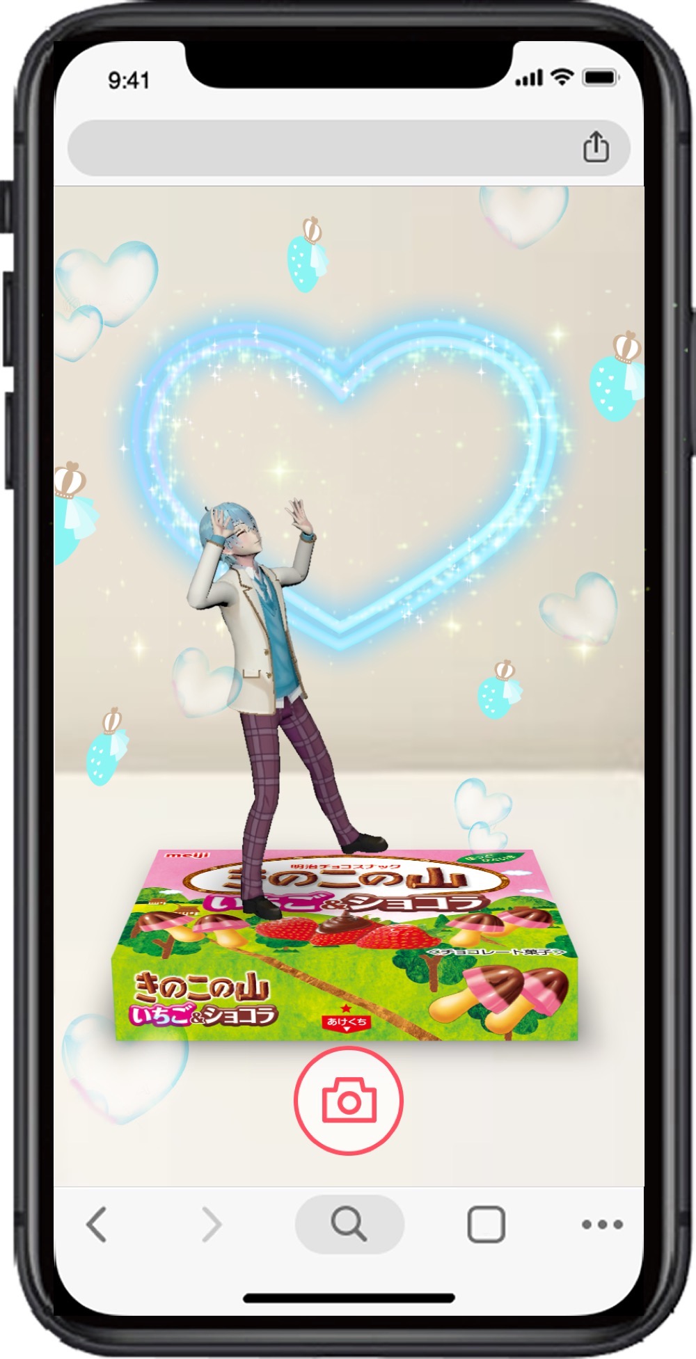 スマートフォンで対象商品のパッケージにARカメラをかざすと、すとぷりメンバーのひとりが目の前にランダムに登場。「青春チョコレート」が流れる中、ハートやいちごが降り注ぐ。