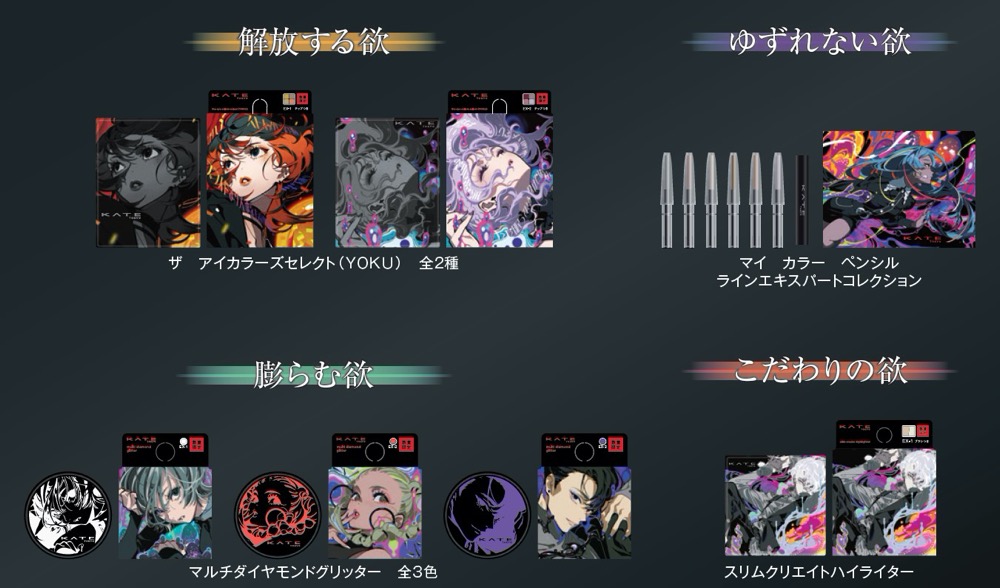 イラストは、膨れ上がり、花開くような“欲”をイメージしており、4色セットアイシャドウには「解放する欲」、6色入りペンシルセットには「ゆずれない欲」、ジェルグリッターには「膨らむ欲」、ハイライトには「こだわりの欲」とそれぞれのアイテムに“欲”にまつわるタイトルが付けられている。
