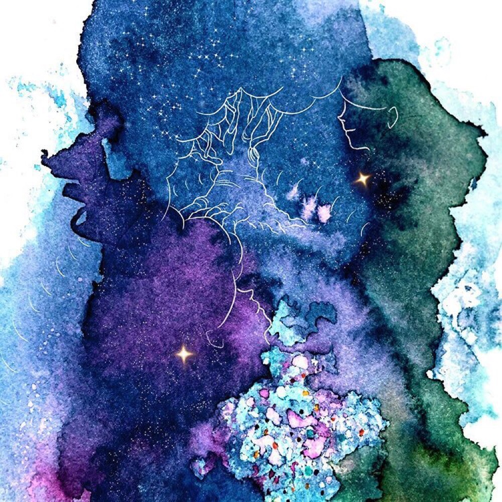 ABTの水性インクならではの特徴である透明感、ぼかし、混色が効果的に使われていて、壮大かつ繊細で表情豊かなファンタジーの世界を感じられます。一見すると抽象的な水彩アートや宇宙画に見えて、よく見ると一本の木に引き寄せられるように向かうふたりが浮かび上がる構成も面白いと思いました。
