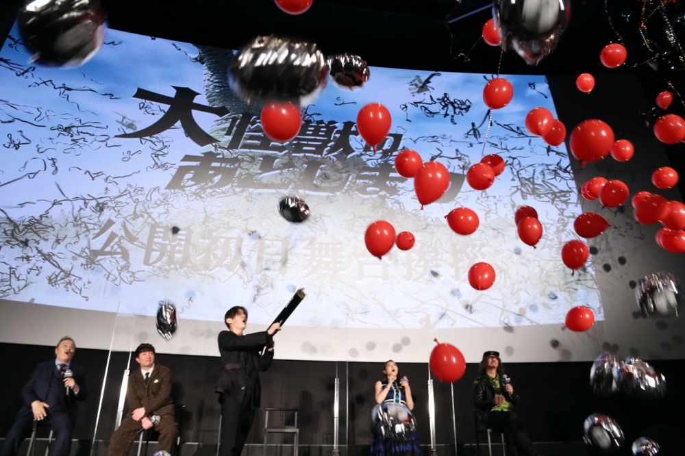 続いて、劇場内に巨大怪獣の隆起を模した巨大風船が出現! 劇中でも登場人物たちを悩ませるこの巨大隆起の”あとしまつ”を任されたのは、主人公のアラタを演じた山田。「(撮影時のランチャーも)これぐらい軽かったらなぁ~」とにこやかな表情を見せながら、本作のポスターでアラタが背負っているランチャーのごとく、バズーカで巨大風船を狙撃! ミッションは見事成功し、中からは公開初日を祝福するかのように、派手な特効テープと共に大量の“大怪獣くん特製風船”が豪快に舞い降り、会場を華やかに彩った。