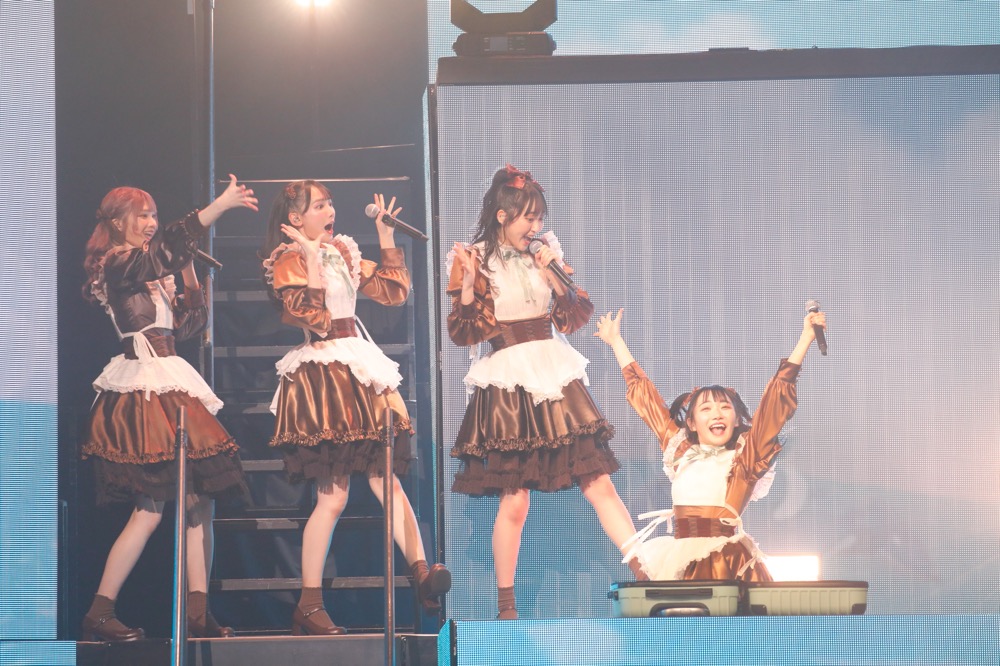 冨田の指の合図で雰囲気が変わると「秘密インシデント」のパフォーマンスへ。続く「クルクルかき氷」では夏らしいグッズを持ってかわいらしいメンバーの姿と、恒例となったウェーブの演出でオーディエンスとの一体感を作り上げた。さらにTikTokで話題となり1億回視聴を突破した「てゆーか、みるてんって何?」が始まると、会場のペンライトが一気に振られ、センターを務める本田が穴から引っこ抜かれて登場する演出で笑いを誘いながらも、その大バズりっぷりを見せつけた。最後にドヤ顔で決めた本田を、鈴木が両手で大きくよけると「ポニーテールキュルン」がスタート。センターの鈴木が、会場を圧倒的なかわいい空間に作り上げ魅了した。