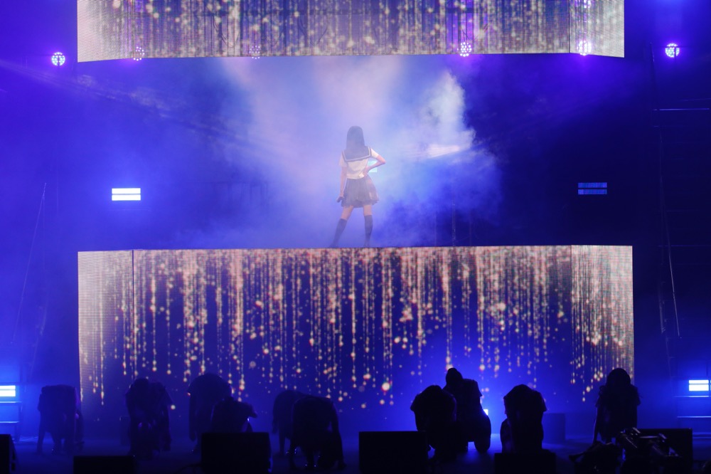 さらにはセンターのLEDが光の中で大きく割れると、そこにはポーズを決めた永田の後ろ姿が。曲に合わせて振り向くと、息を飲むようなキメキメの激しいダンスを披露。永田の合図に合わせて炎が舞ったかと思えば、そのまま永田のセンター曲「ワタシアクセント」へ。ステージ上で永田が操るような炎の演出でド派手にパフォーマンス。昨年開催の『イコノイフェス 2021』での初披露以来、ここまで披露されずにいた理由が確かにそこにはあった。そのまま≠MEの代表的なダンスナンバー「P.I.C.」に突入。強いイメージのある楽曲だが、制服衣装で新しい一面を見せ新鮮さを感じさせた。