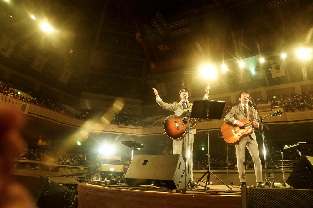 さらに、YO-KINGの「聴きたいでしょう?」というひと言から演奏予定になかった「どか~ん」を演奏すると、最後は「空にまいあがれ」で美しいハーモニーを響かせ、国技館は大きな拍手に包まれた。
