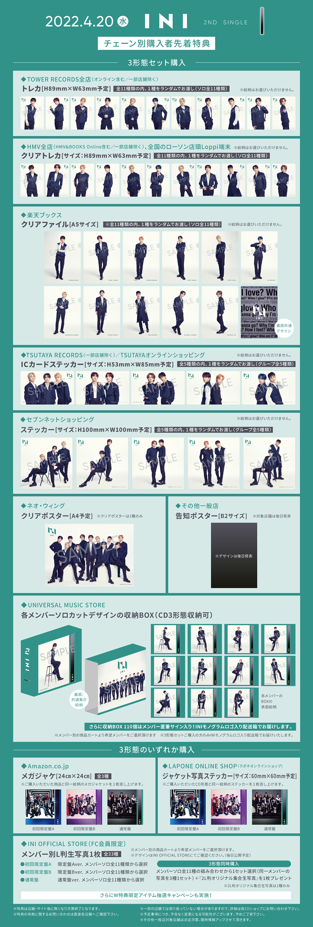 INIが4月20日に発売する2ndシングル「I」のアーティスト写真、ジャケット写真が解禁。対象店舗限定の先着特典絵柄も公開された。