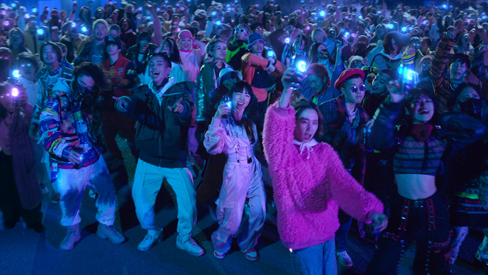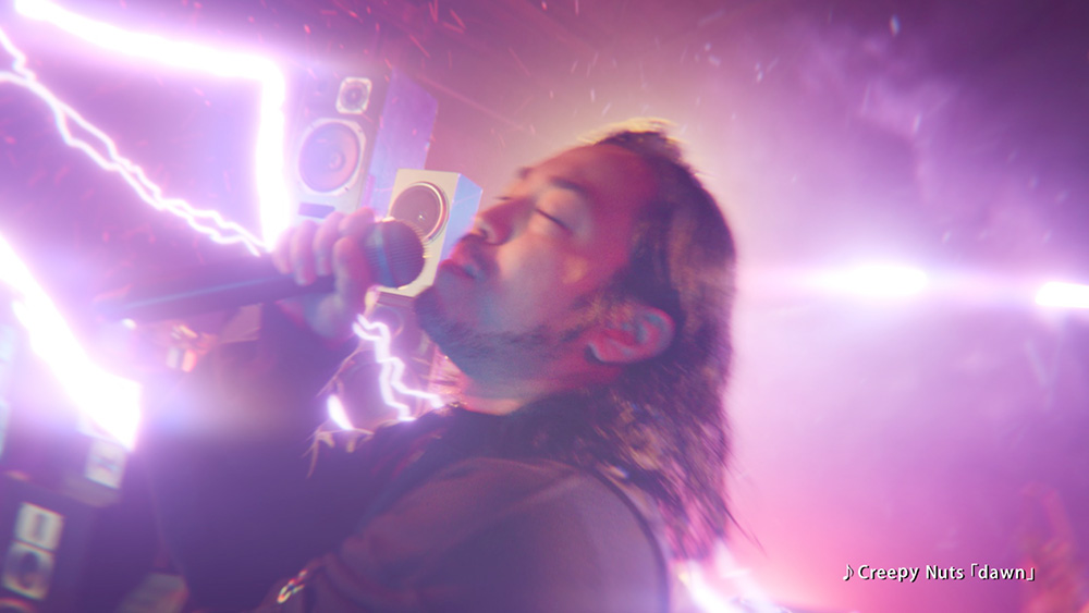 Creepy Nuts出演の「無敵のゾーンへ Creepy Nuts Vol.2」は、新曲「dawn」とともに、彼らの世界に引き込まれていく、勢いのあるパフォーマンスが見どころです。夜の東京にたたずむ解体中のビルに“ZONe”を手にした若者たちが集まり、そこに設置されたライブセットでCreepy Nutsのライブが始まる。