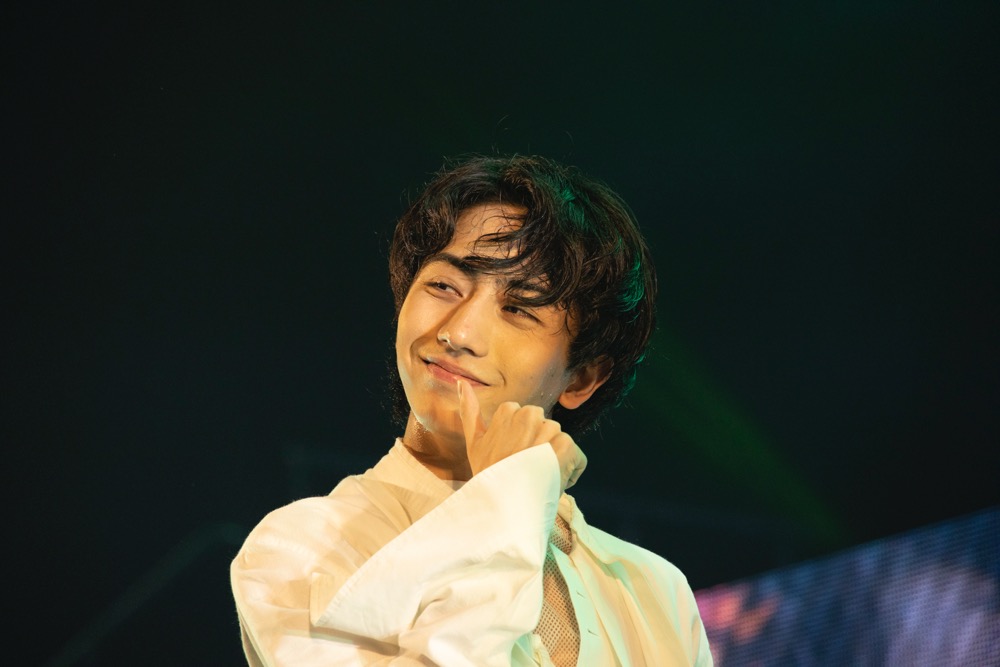 次元の狭間に生きる彼らのライブでは、映像とのコラボレーションも大きな見どころ。「今日は僕たちと皆さまで素敵な思い出を作っていきましょう!」と贈られたラブソング「シェイクスピアに学ぶ恋愛定理」では、7つのパネルに映し出される7人の甘い笑顔に花びらが舞い、トリッキーな疾走曲「以呂波 feat. fox capture plan」では言葉遊びに満ちた文学的リリックが画面を埋め尽くして、摩訶不思議な空気を際立たせてゆく。夜の2部では冒頭の「いってきます!」を担当していた杢代和人の発案により、他メンバーが「いってきます!」に挑戦する場面も。小泉光咲は宮城弁で「いってきますっちゃ!」と愛らしく首を傾げ、武藤はフェイントで2階から登場して観測者を楽しませた。続いて黒いジャケットを羽織って大きな目玉が底知れぬ不気味さを醸す「柘榴」を挟み、一転「豪雨」では、哀しい物語をエモーショナルなダンスのみで表現。バレエ歴の長い吉澤要人を筆頭に、エレクトロスウィングで躍動する「J*O*K*E*R」から「夢に唄えば」と、端正なショーダンスで魅せるパートも見ごたえ十分で、パフォーマーとしての確かな進化を感じさせる。
