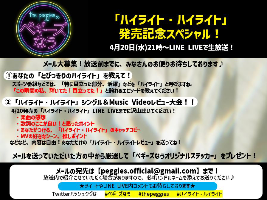 そして、シングル「ハイライト・ハイライト」発売日の4月20日にthe peggiesの特別番組『the peggiesの!ペギーズなう』がLINE LIVEで生配信されることも発表された。
