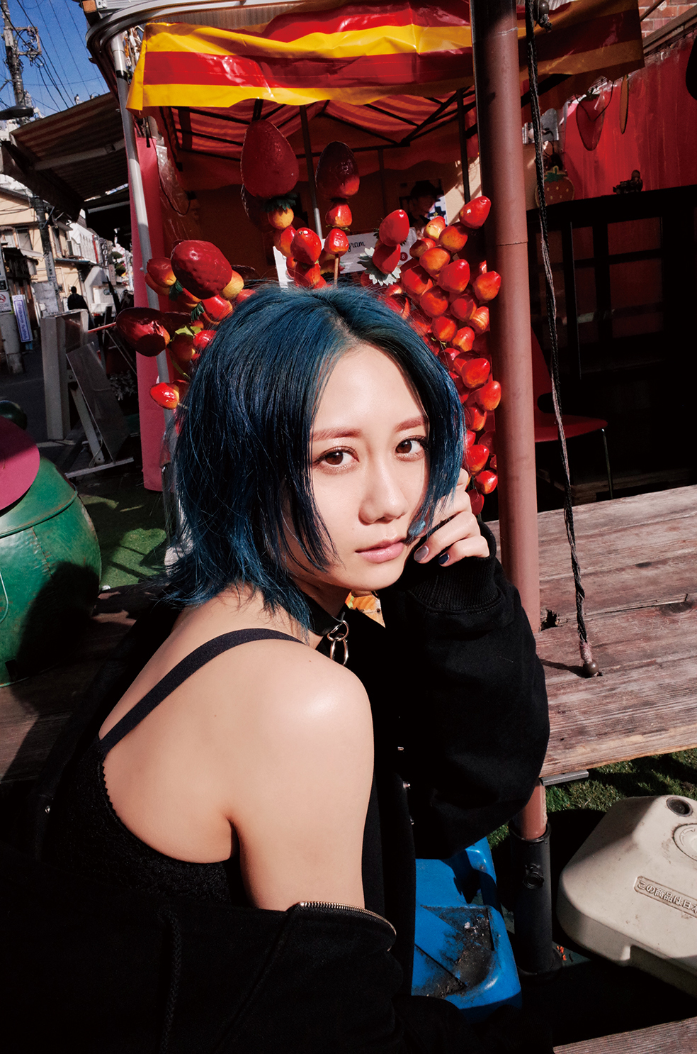 青髪での撮影のメインの舞台となったのは東京の繁華街。クールな髪色で、ストリートから極彩色のガールズバーまで街を泳ぐ姿は、古畑奈和にしか表現できないリアルとファンタジーの中間のような不思議な世界観となっている。