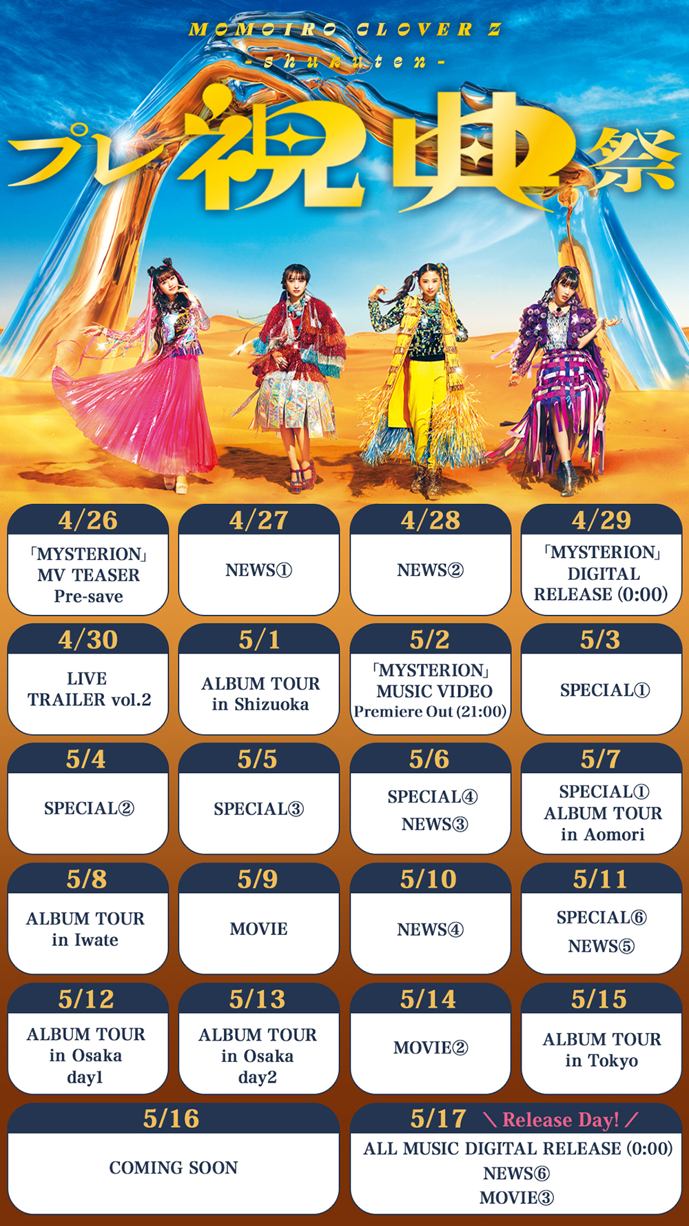 26日に公開されたティザー映像では、「MYSTERION」のMVのの冒頭映像を公開。砂漠にそびえ立つ聖堂のなかにいるメンバーが水晶を宙に掲げる様子が映し出されており、“祝典”の始まりを予感させる内容となっている。