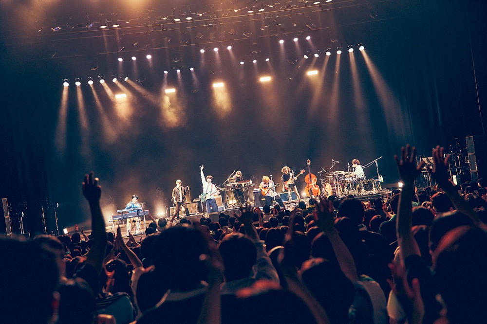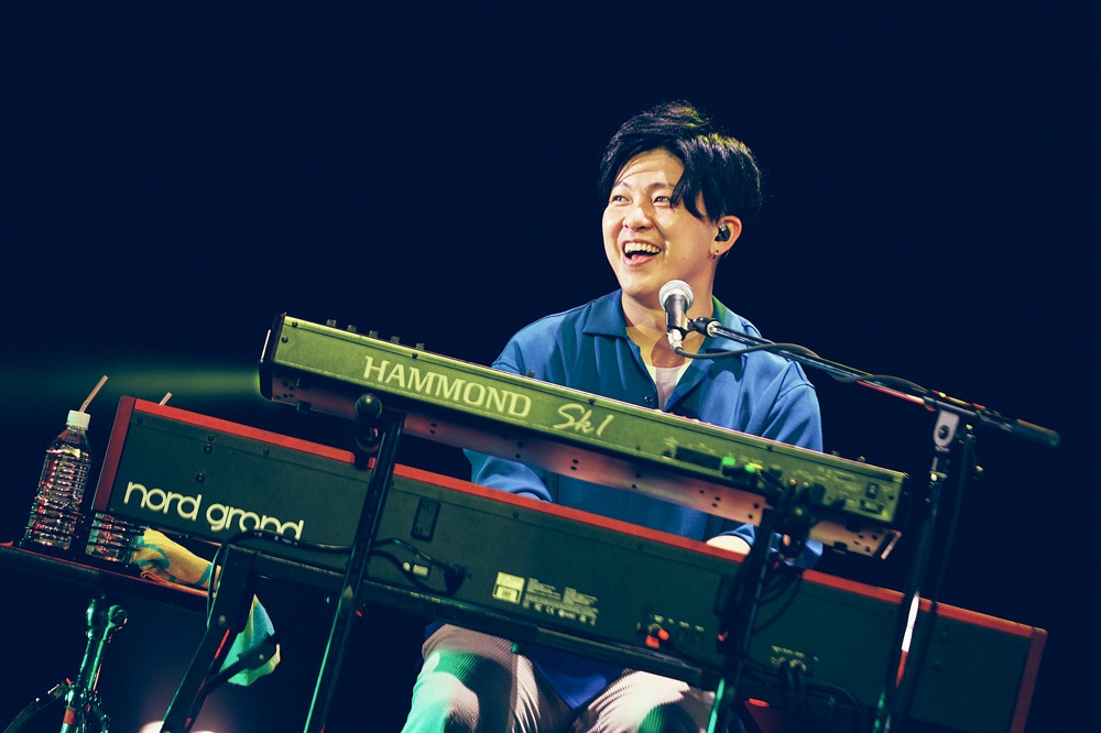 「ふっかつのじゅもん」では黒田が前へ出て華々しいギターソロで魅了。後半はsumikaのエッジーな側面が顔を覗かせ、ダークなエレクトロ要素を打ち出した「Babel」、ジャジーで艶やかな「Stawberry Fields」は荒井の繰り出すビート感が心地よい。一連の流れで深遠な世界へと誘ったあとは、アカペラでコーラスをする際にメンバーが顔を見合わせる姿が微笑ましかった「Summer Vacation」、そして圧倒的なメロディの美しさに聴き惚れた「願い」。sumikaというバンドの多面的な魅力が、セットリストにしっかりと反映されていた。