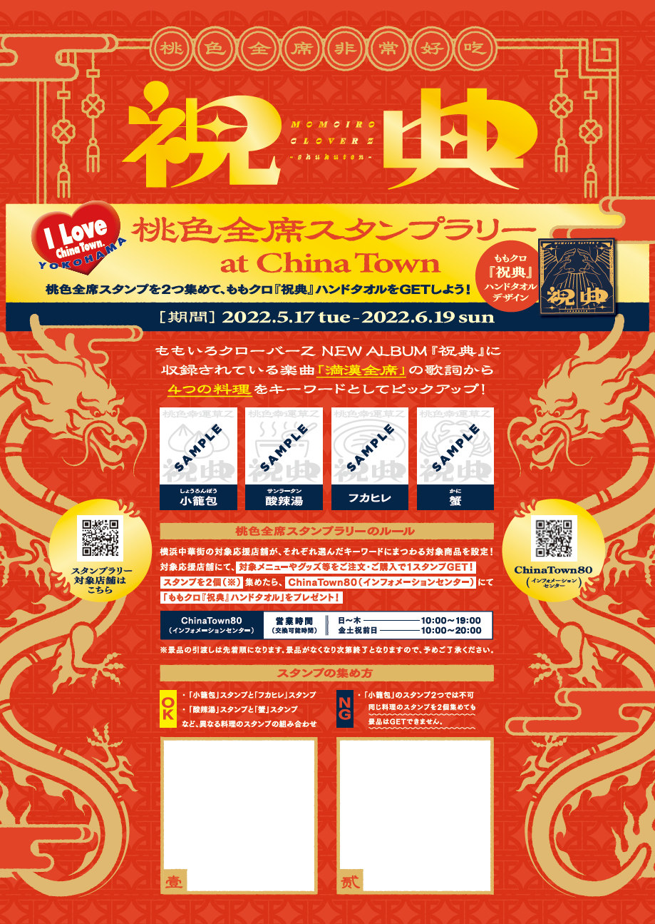 ももいろクローバーZが6thアルバム『祝典』のリリースを記念して、神奈川・横浜中華街とコラボ。コラボキャンペーン「桃色全席スタンプラリー at China Town」が、5月17日から6月19日まで開催される。