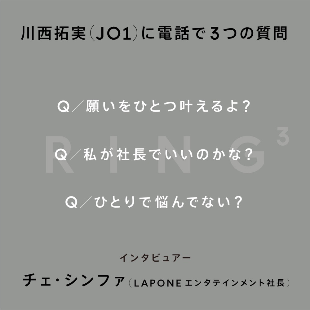 チームJO1として同じ夢を共に追いかけてきた社長からの質問に、川西はどう応えるのか。本企画で明らかになる川西拓実の本音と素顔とは――。