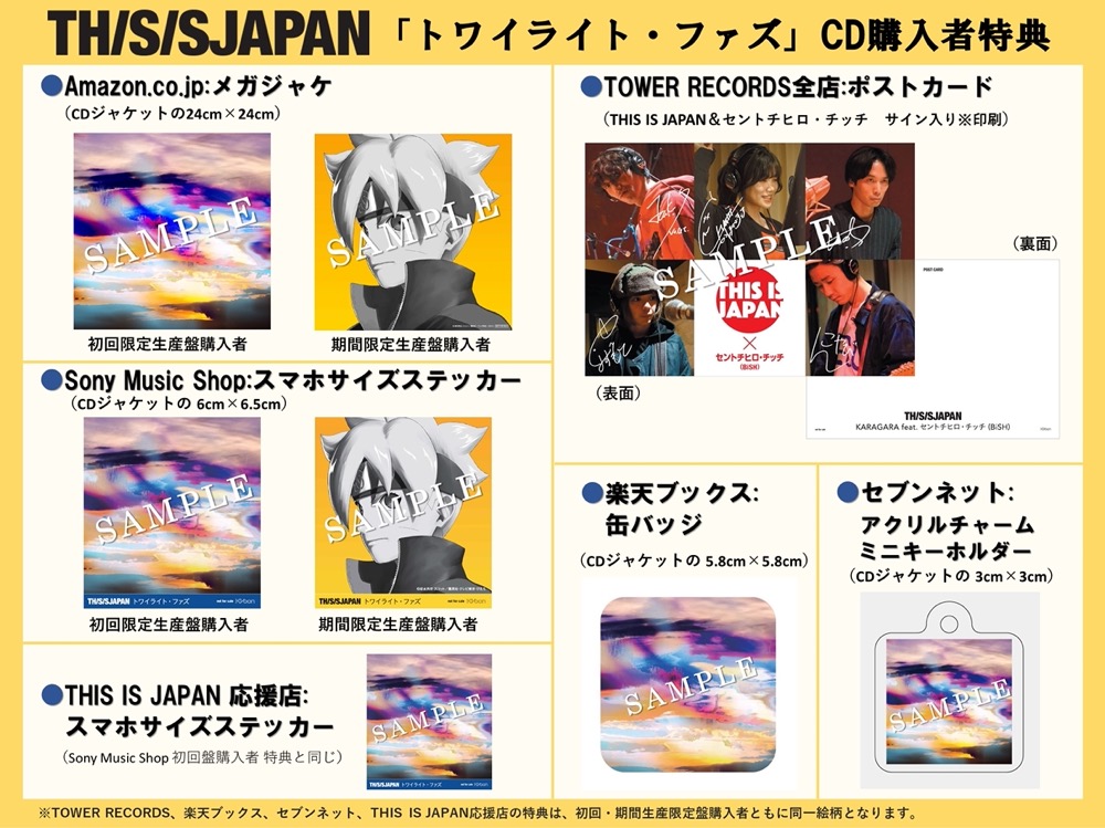 THIS IS JAPANのニューシングル「トワイライト・ファズ」には、“楽器を持たないパンクバンド”BiSHのメンバーである、セントチヒロ・チッチが参加した楽曲「KARAGARA feat. セントチヒロ・チッチ(BiSH)」の他、Z世代から圧倒的な支持を得る、変幻自在なクロスカルチャープロデューサーmaeshima soshiによる「トワイライト・ファズ maeshima soshi Remix」も収録されている。