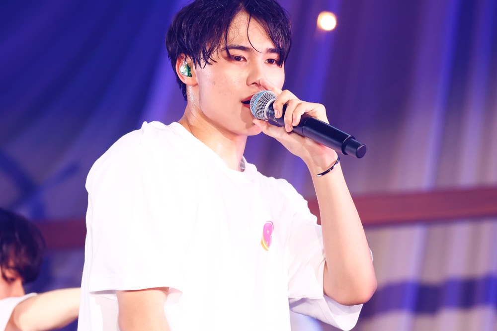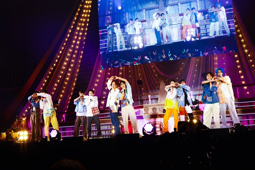 そして、メインステージに戻ったメンバーが前日に横浜武道館でワンマンライブを開催した同じ事務所のアイドルグループ、超ときめき宣伝部のヒット曲「すきっ! 〜超ver〜」を歌い出すと、驚きと喜びが混じった歓声が湧き上がった。「すきっ!」というフレーズが計114回も登場するラブソングを一切ふざけることなく、キュートなセリフや仕草も含めて全力でカバー。最後は2人1組でハートを作り、アイドルのように煌めく笑顔で締めくくった。パフォーマンス後にKEVINが「いや、最高! リハから楽しかった。僕、ひよりんになりました」と充実した表情で語ると、場内スクリーンにも映し出されている配信のコメント欄には「かわいすぎ」「大好き」というコメントが多数寄せられていた。
