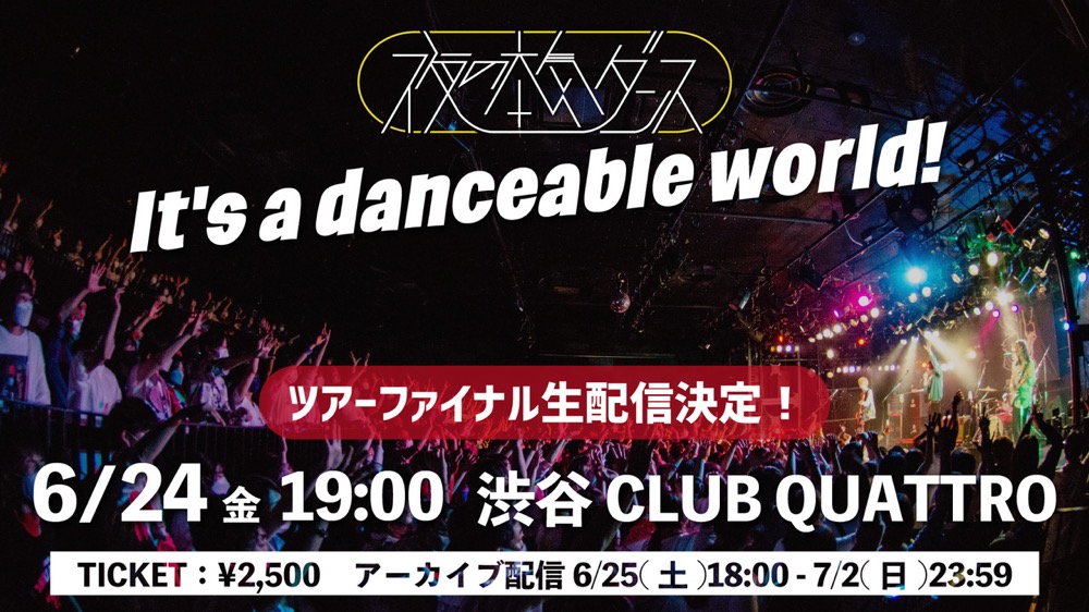 6月24日の東京・渋⾕CLUB QUATTRO公演のチケットは即日完売。惜しくもチケットが取れなかった人はもちろん、すでにツアーに参加した人も、夜ダンの超踊れるツアーファイナルを配信で楽しもう。