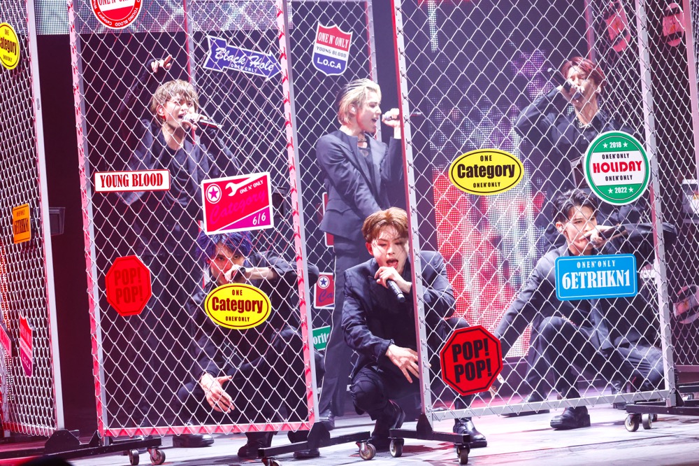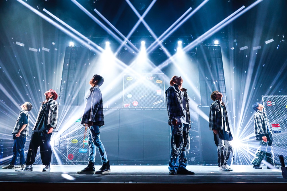 そうしてオーディエンスを誘惑してからは、6枚のフェンスに囲まれた中から全員で飛び出すという象徴的な始まりから、20分にもわたる怒涛のメドレーで“ザ・ワンエン”なショータイムを体現。アグレッシブなラップが炸裂する「Category」に「Dark Knight」という代表曲2つを、HAYATO、KENSHIN、NAOYAのラッパー組によるダンスブリッジで一続きにする展開も今回が初めて。サビを歌うTETTAとEIKUの横で4人がフェンスを動かし、彼らが卓球部員を演じたドラマ『FAKE MOTION』の劇中歌でもある「SMASH」に繋げて情景を卓球のネットとリンクさせたりと、フェンスを巧みに活用しての素早いフォーメーション移動も見応え満点だ。重心の低いビートで魅せるスリリングなダンスセクションを挟み、「Shut Up! BREAKER」でもフェンスでメンバーが左右に分断されるという演出で楽曲のメッセージを伝えながら、社会への反抗と葛藤を描き出す。そこから別れを歌う「Donʼt worry」への流れもストーリー性十分で、感傷的なダンス表現で描き出したドラマは「Black Hole」で劇的な幕切れへ。スポットライトのなか、KENSHINが5人を操ってドープな世界へとオーディエンスを引きずり込み、紫のライトの下で胡乱げにシャツをたくし上げる彼らの様は、まるで闇落ちラストのごとし。最後は再びフェンスの囲いの中に戻っていくというエンディングには、良い意味で背筋が寒くなるものを覚えた。