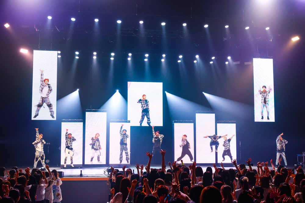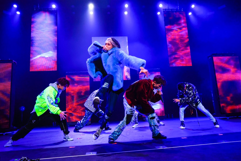 しかし、彼らの真骨頂は、やはり不遜でマッシブなパワーにあり。カラフルでド派手な新衣装に着替えて、彼らの強面なイメージを決定づけたデビュー曲「I’M SWAG」を、このクライマックスでここぞとばかりに投下する。インパクト強烈なイントロからシーンに衝撃を与えたハードなナンバーを軽々とこなして貫禄さえ漂わせる彼らだが、その最新形とも言えるのが1st.EPの表題曲「YOUNG BLOOD」だ。「これでラストだ……いくぞ!」とKENSHINが雄叫びをあげ、レーザー光線が飛び交うなか、大地を揺らすような重低音&アッパービートに乗って床を踏み鳴らすダンスはワンエン史上最高の難易度。ディストーションの利いたラップ&ボーカルが轟けば、どんどんテンションの上がる場内に、ステージからはスモークまで噴き上がって、歌詞の通り“HeroよりVillain”なワンエンの魅力をとくと堪能させてくれた。