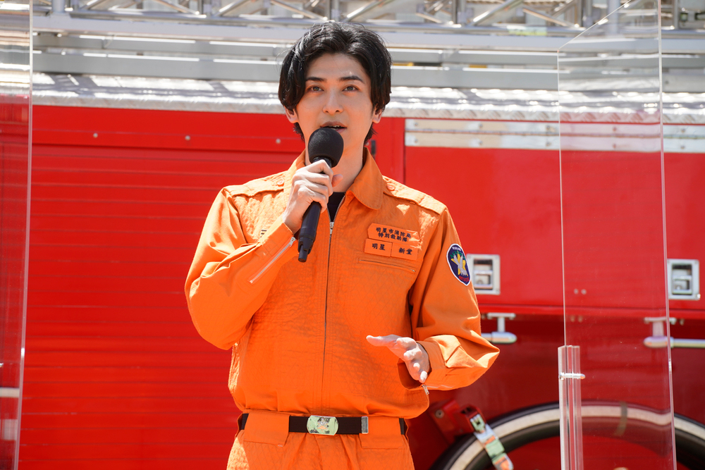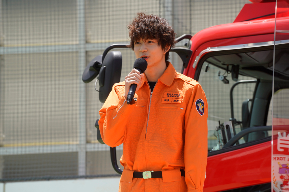 イベントの前に「暑いんで、こまめに水分補給して、喉が渇いたなと思ったときには水分が足りてないんで。今日は楽しんでください」と屋外でのイベントにあたって注意を促した岩本は、この日、劇中の姿で登場し「簡単に着られる服ではないので、身が引き締まりますよね」と語り、消防訓練イベントへの意気込みを見せた。