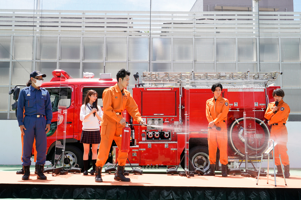 “消防訓練”のために、グラウンドに集まった青稜高等学校の1年生120人を前に、MCの呼び込で登場したのは消防車。そして消防車の後部座席から姿を現したのはなんと消防士姿の岩本照、鈴木仁、浮所飛貴、古川雄大。サプライズで登場したキャストの登場に会場は大盛り上がり。さらに、会場後方よから制服を身に纏った生見愛瑠が登場し、会場はさらなる歓喜の声と盛大な拍手に包まれた。