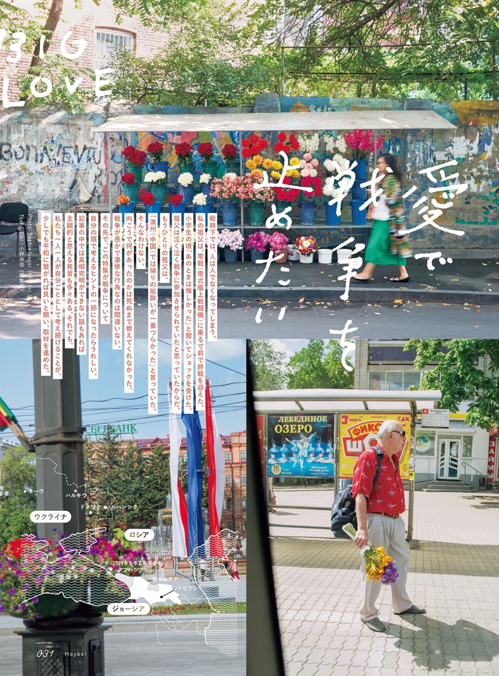 そして、注目のコーナーは「愛で戦争を止めたい」。この浅はかとも思われるテーマを、駐日ジョージア大使ティムラズ・レジャバ、一般のジョージア人やロシア人、そして返還50周年を迎えた沖縄出身者たちへ問いかけている。沖縄編では二階堂ふみ、スリムクラブ、ゴリ(ガレッジセール)、上原沙也加(写真家)らが登場。読み進めるにつれ、戦争をとりまく構図、そして他者への理解と愛について考えさせられる内容となっている。