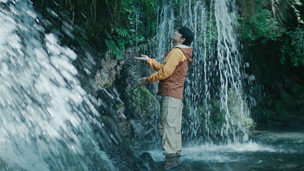 ふと水辺に何かを見つけて歩み寄る福山。手にしたのは木から落ち水辺に留まっていた椿の花。「水を含んでいるから、枯れずにいたんだろうね」と、たった一輪の花が示した生命の根源に水があることを体感する様子もオフショットとして公開。もちろんCM本編では観られないシーンだ。