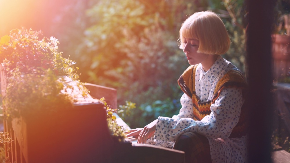 約4年ぶりの撮影は、前回のCGを使ったポップな世界から一転して、イングリッシュガーデンの中で自然を感じながらの撮影でした。ここで弾いているピアノは、私の3rdアルバム『Scratch』のジャケットに登場したピアノで、実に15年ぶりの再会でした。撮影当日まで知らされていなかったので、とても嬉しかったです。すてきな時の流れを感じながら、自然の中でさらりとした梅酒を飲む。とても贅沢で癒される時間でした。