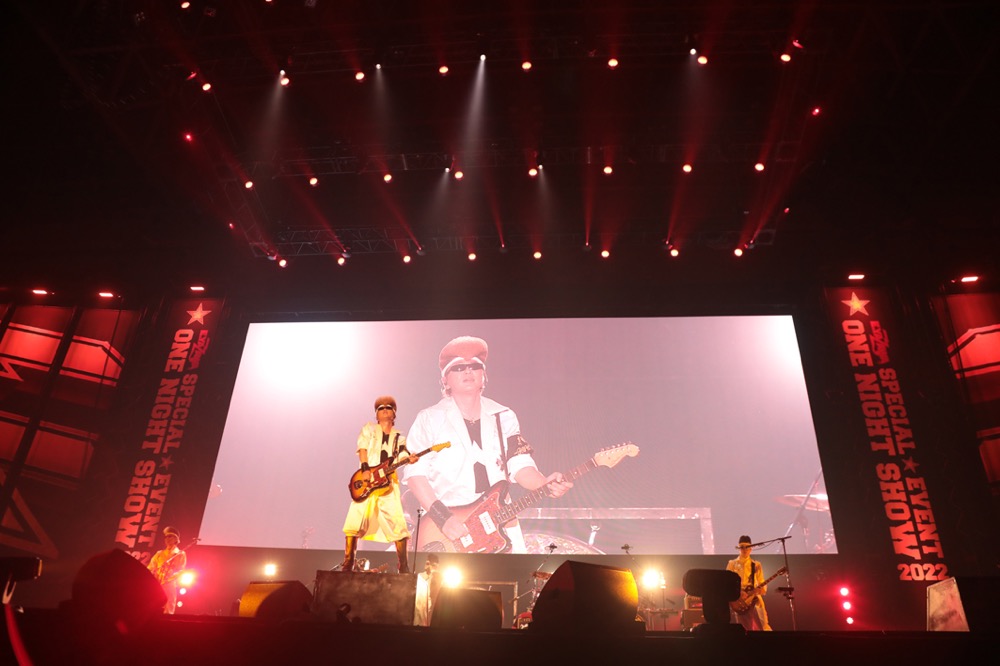 ここでヒートアップした会場を鎮めるようにロッカバラード曲「洛陽」を披露。今夏、3年ぶりに有観客開催される氣志團万博の開催地、木更津の街を歌った曲だ。夕陽をイメージした場内の真っ赤な照明の中に浮かび上がるように綾小路翔が情感たっぷりに歌う。そして最後、「夏はこの曲で行こうぜ!」と始まったのは「ファンキー・モンキー・ベイビー」。前日の布袋寅泰も演奏した、永ちゃんファンにとっても特別な曲。集まったオーディエンスを最高潮に盛り上げ40分のステージを駆け抜けた。矢沢永吉で始まり、矢沢永吉で締めた圧巻の氣志團のステージであった。