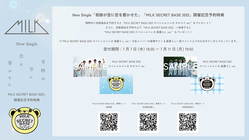 7月9・10・11日に東京都内にオープンするM!LKのPOP UP STORE「M!LK SECRET BASE 2022」の開催を記念した限定特典が決定した。