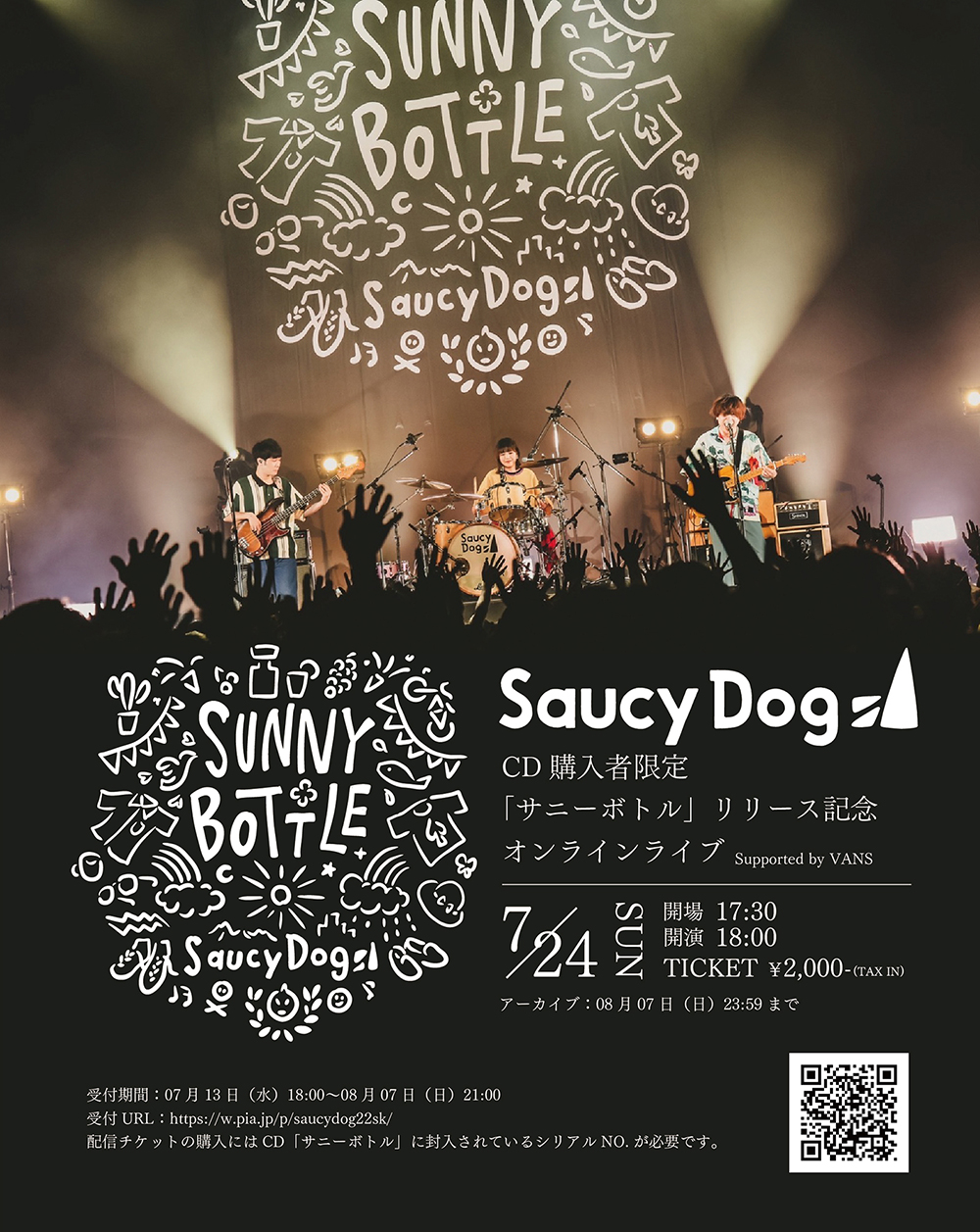 Saucy Dogが7月4日に東京・Zepp DiverCity(TOKYO)にて開催した『「サニーボトル」リリース記念ワンマンライブ Supported by VANS』の模様が、7月24日18時からオンライン配信される。