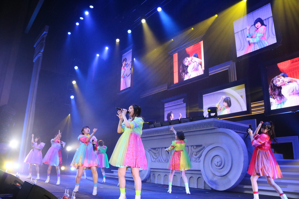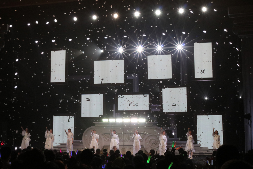 すると、今回初披露となる元JUDY AND MARYのTAKUYAが楽曲提供した「青春ゾンビィィズ」のイントロが流れ、9人はキャッチーなダンスでパフォーマンス。予期せぬサプライズに会場の熱狂は最高潮に達し、続けて「Anytime, Anywhere」を披露した。