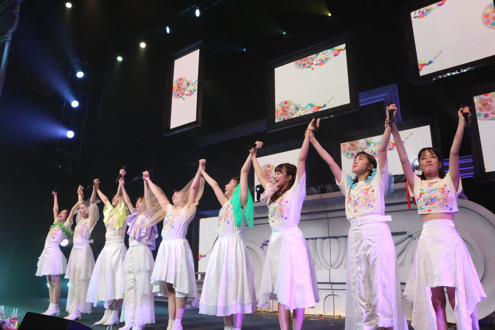 風見和香の「続いてもアルバムのなかから一曲披露させていただきたいと思います!」の合図で、7thアルバム収録曲「シュガーグレーズ」「きゅるん」「トキメキ的終末論」と3曲を連続披露。女の子らしくもカッコいいポップな曲を色気溢れるダンスで、ファミリーを魅了した。