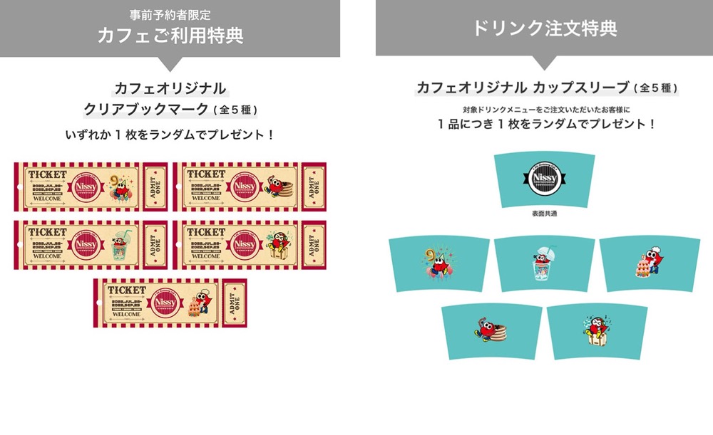 事前予約(税込715円/1名)を利用して、メニューを注文した人に「カフェオリジナルクリアブックマーク(全5種/ランダム)」が1枚プレゼントされる事前予約者限定カフェ利用特典、カフェでドリンクメニューを注文した人に「カフェオリジナルカップスリーブ(全5種/ランダム)」が1品につき1枚プレゼントされるドリンク注文特典など、様々な特典にも注目だ。