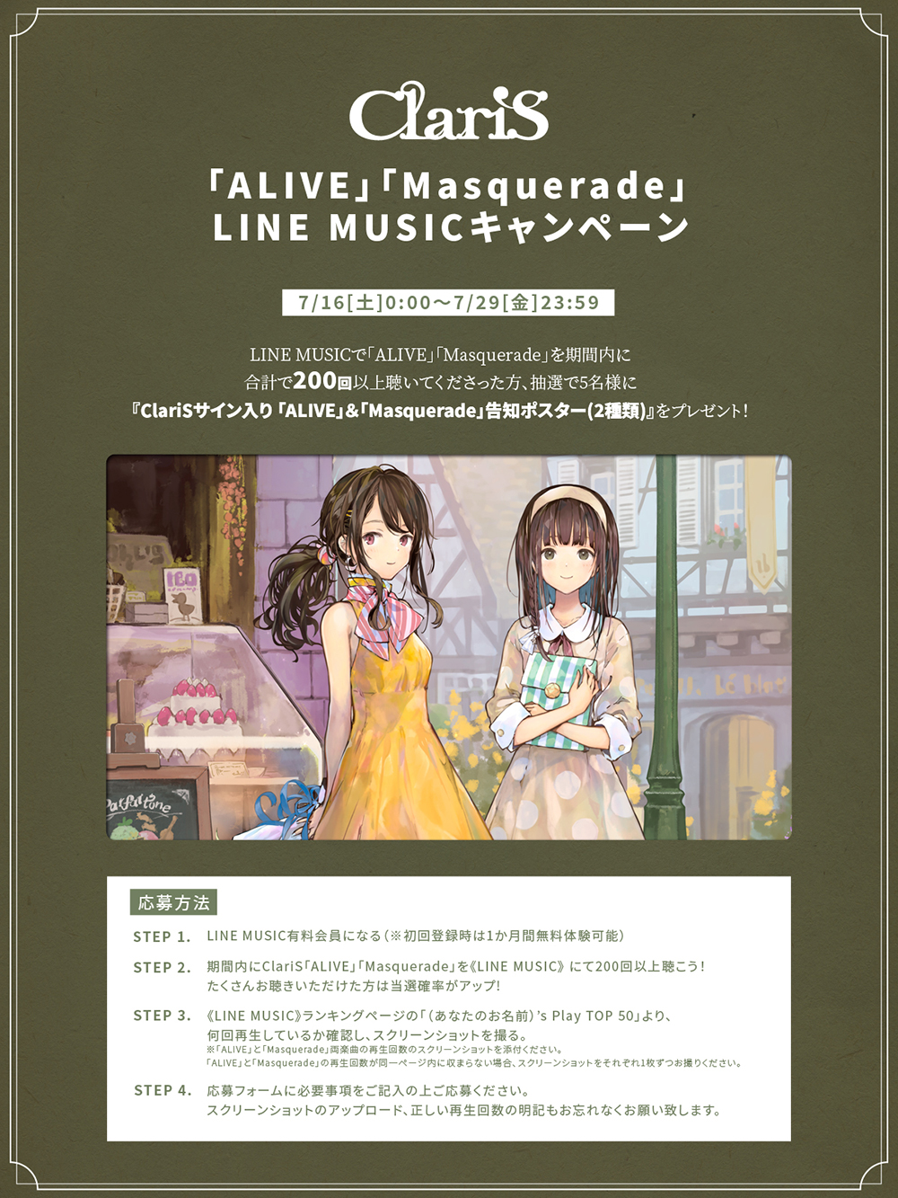 LINE MUSICでは、先週配信がスタートしたClariSの新曲「ALIVE」と「Masquerade」を期間内に合計で200回再生以上聴いた人のなかから抽選で5名に『ClariSサイン入り 「ALIVE」&「Masquerade」告知ポスター(2種類)』をプレゼントする「LINE MUSICキャンペーン」が行われる。詳細はオフィシャルサイトで。