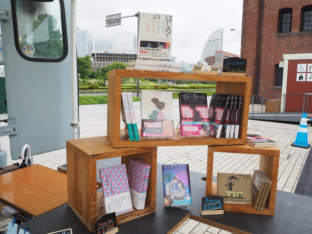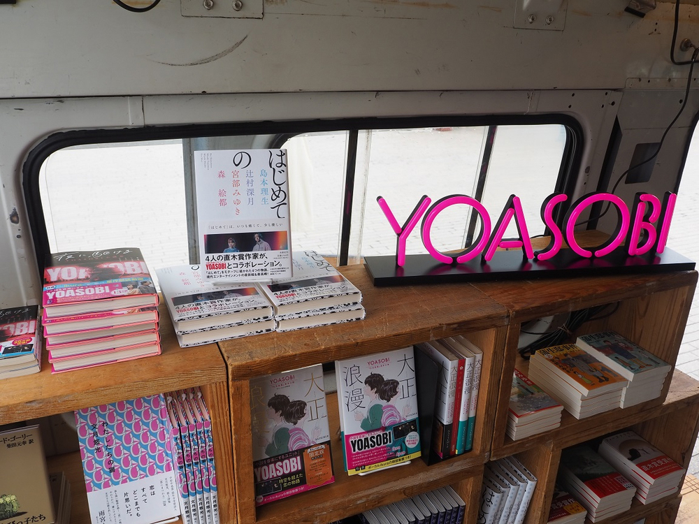 「旅する本屋さん YOASOBI号」では、YOASOBIの楽曲の原作小説をはじめ、原作小説作家の関連作品やMVを手掛けたクリエイターの作品集、Ayaseとikuraがセレクトをした書籍などの関連作品をラインナップ。「旅する本屋さん YOASOBI号」のロゴが刺繍されたTシャツも限定販売される。