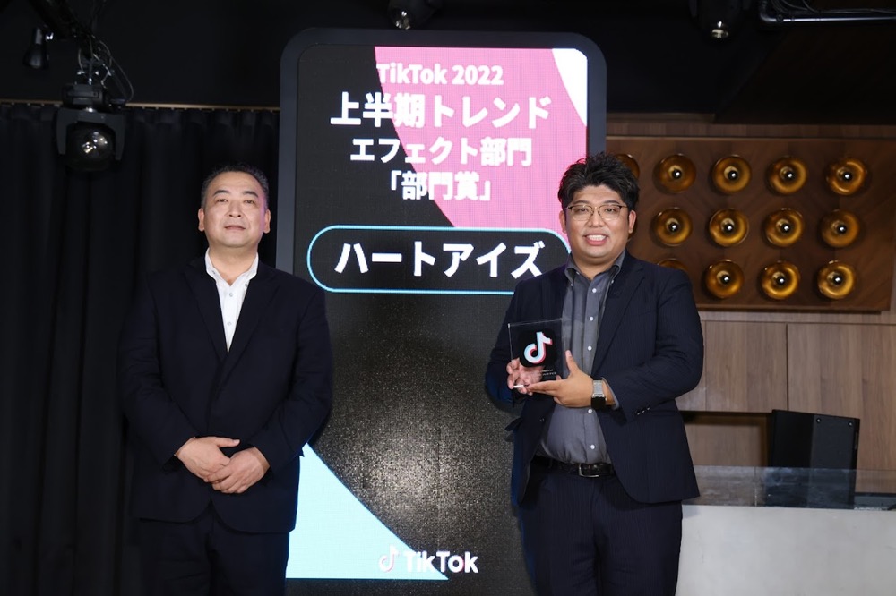 「TikTok2022上半期トレンド」エフェクト部門賞は、「ハートアイズ」が受賞。上半期に多くの方に使用されたことはもちろん、エフェクト部門ノミネート10選の中で圧倒的な投票数を稼ぎ、多くのユーザーに愛用いただいた エフェクトとして受賞となった。結果発表時には、「ハートアイズ」のエフェクトを利用した投稿が大反響を呼んだTikTokクリエイター、大京警備保障が代表して登壇した。