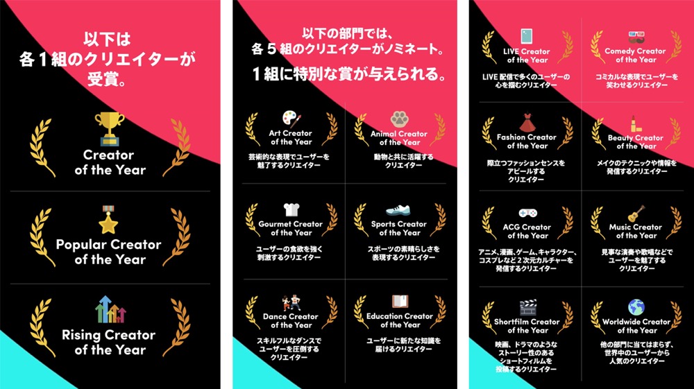 また、年末に「TikTok AWARD 2022」を開催することが決定した。今年1年間を通じ、最も活躍したクリエイターや人気を集めたクリエイター、多くのフォロワーを獲得したクリエイターなどを、下記17の部門で決定し、表彰する。受賞するクリエイターは、12月に実施される予定の表彰式に登壇する。