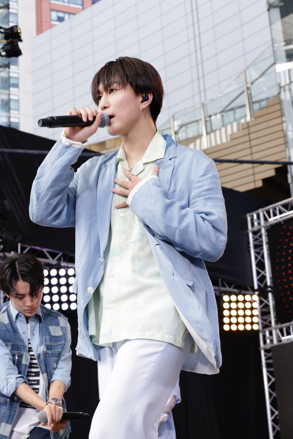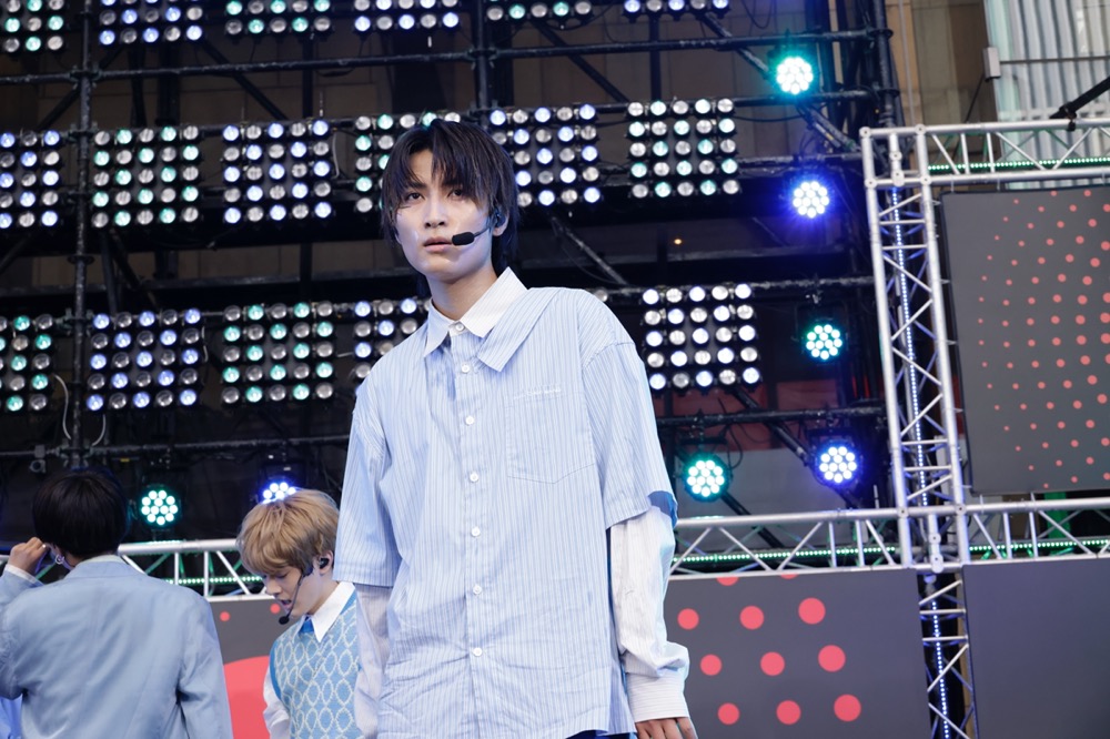 この日は日中の気温が30度超えとなったため、MCでは口々に水分補給を呼びかける一方「忘れられない夏にしていきましょう」(池田彪馬)、「ぜひ僕らと一緒に熱い夏を過ごそうぜ!」(志村玲於)といった言葉も。おなじみとなった伊藤壮吾の車内アナウンスも、この日は日比谷線バージョンで届けられた。そして「人生で初めてパーマをかけてみました」と告白したジャン海渡が「俺らについてこれますか! 最後まで楽しんでいきましょう!」と煽ってからは、恋愛度の高い楽曲で濃密な感情を描きだしていく。古川&池田のクリアなボーカルで曲名どおりの夏風を運び、それぞれのセクシーな仕草でも魅了する「Summer Breeze」に続いて、メンバー同士で絡む振りや歌声からも艶めかしさが香る「love or like(Tokyo)」では、ジャンに頤を捉えられた田中洸希が思わず吹き出してしまう場面も。全英詞の「BLOODY LOVE」ではダークな色合いを押し出し、不敵な空気を振りまく9人にドッと拍手が湧いた。