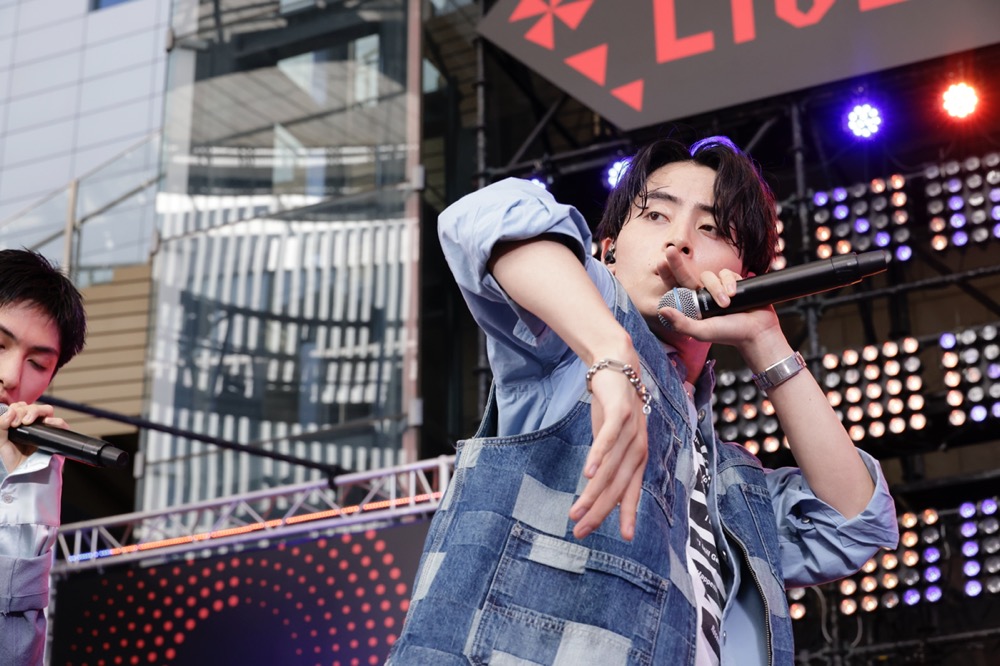 事あるたびに雨を呼ぶグループとも言われるSUPER★DRAGONだが、晴天の空に「雨降んなくてよかった! 晴れBLUEのおかげ」と飯島颯も感謝。さらに「野外ということで……今日だけのスペシャルメドレーを持ってきたんで、やっていいですか?」と松村和哉が問いかけてからは、アッパーなライブ鉄板曲をてんこ盛りにした贅沢なメドレーで、SUPER★DRAGON自慢のアグレッシブな空間を展開する。まず、獣のように衝動露わなパフォーマンスでBLUEを揺らす「LRL -Left Right Left-」では、大きく跳躍する志村を皮切りに9人でソロダンスを繋ぐアレンジでも魅せると、松村の歪んだ低音ラップが冴える情熱のラテン曲「La Vida Loca」へ。続けざま「Mada’ Mada’」に「BADASS」と、ラウドなヘヴィロック曲でオーディエンスの身体を燃やし、自身の決意を込めたセルフタイトル曲「SUPER★DRAGON」で今度は心を熱くするという流れも、グッと胸に迫るものがある。さらに、タオルを振りたくる「Dragonfly」で仲間との絆を鼓舞して、トドメの一発となったのが「Untouchable MAX」。歌詞のとおり“近づいたら火傷”しそうな勢いで9人一丸となってのシンクロダンスを繰り出し、田中のヒューマンビートボックスが炸裂すれば、体感温度は明らかに急上昇の一途をたどる。