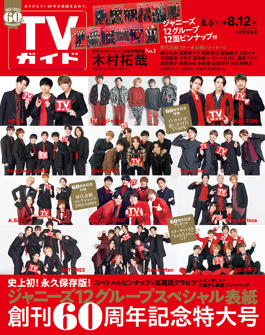 TVガイド創刊60周年記念特大号となる『TVガイド2022年8/12号』(一部地域を除き8月3日発売)にて、ジャニーズ12グループによるスペシャル表紙という史上初の試みが実現する。