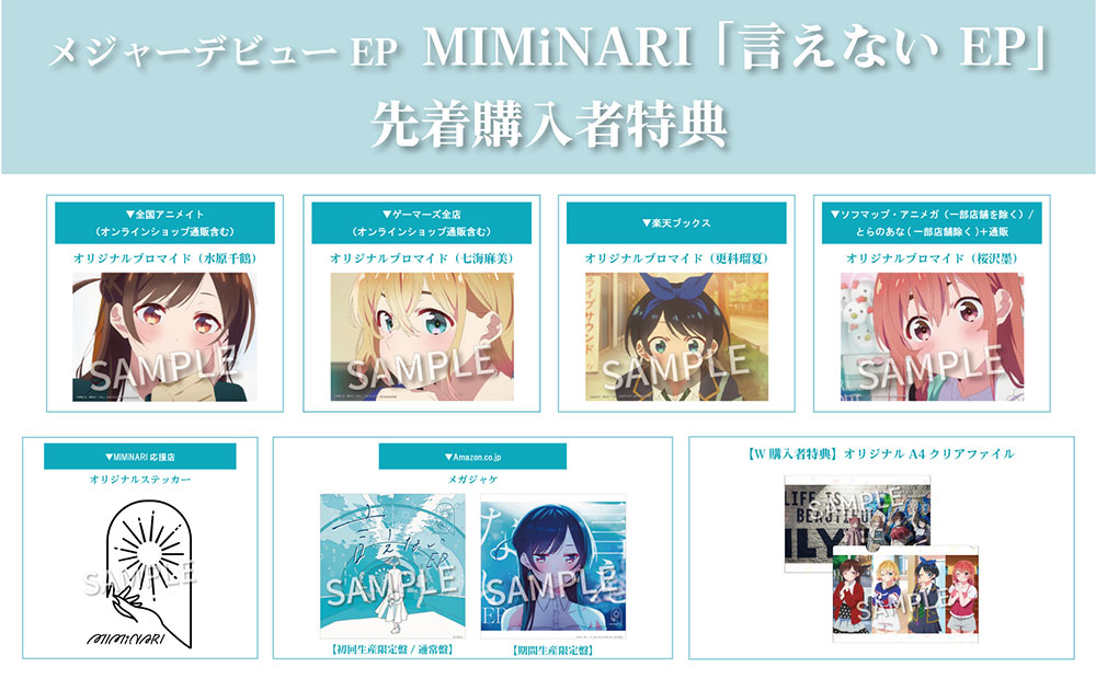 MIMiNARIが8月31日にリリースするメジャーデビューEP『言えない EP』のジャケット写真、封入特典のミニポスター、法人別特典の絵柄が公開された。