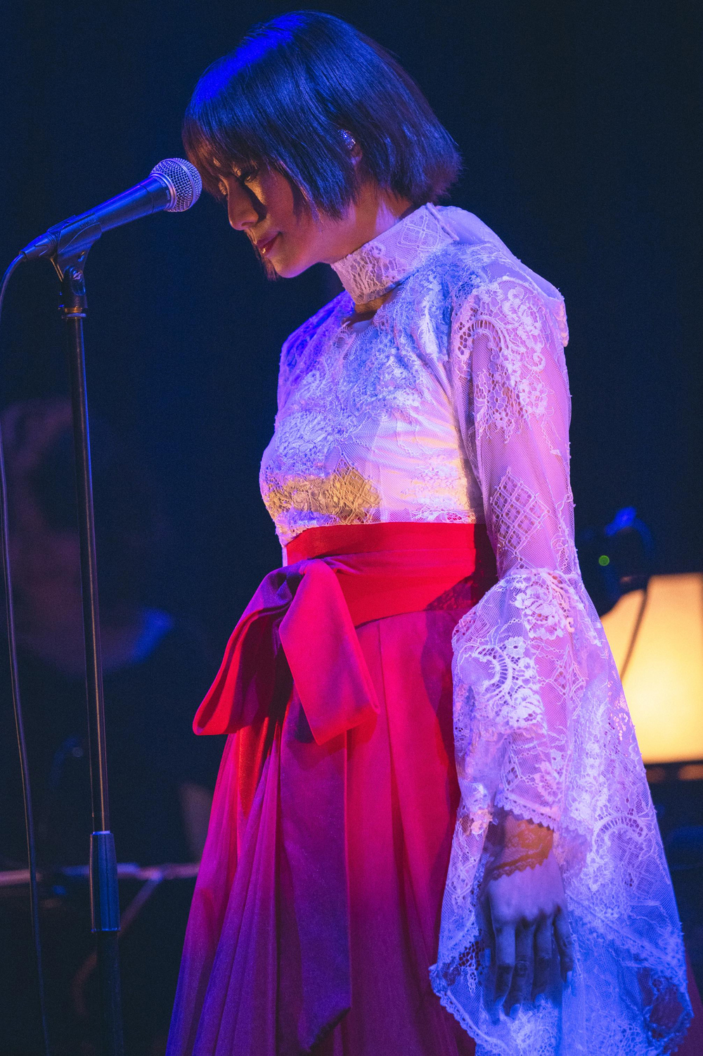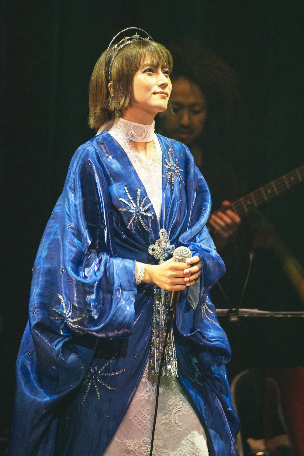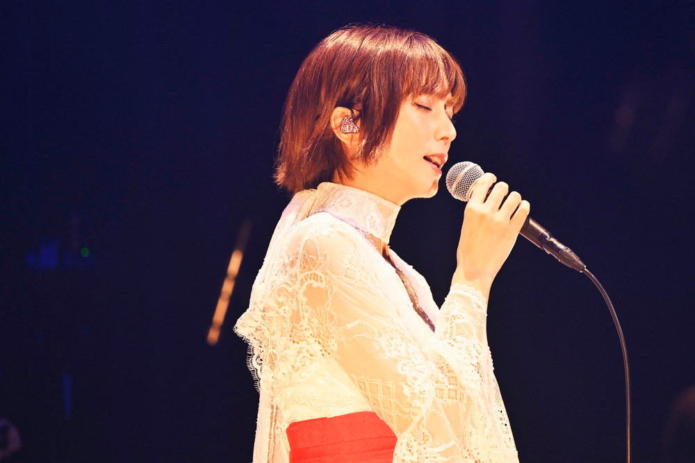 さらに、「私にとって歌詞や言葉を紡ぐこと、歌うことは“祈り”に近いものがあります。和の世界観が好きということもあり、恐れ多いのですが、祈りや願いを込めて歌うという思いで“巫女の宴”と名付けました」と明かし、「それぞれの心に届いて、豊かな気持ちになってもらえたらいいな。もしも傷があるんだったら、癒やされてほしいなという思いで歌っております」と語ると、満員の客席からは、彼女の祈りの歌が心にまっすぐに届いてることを伝えるかのような温かい拍手が湧き上がった。