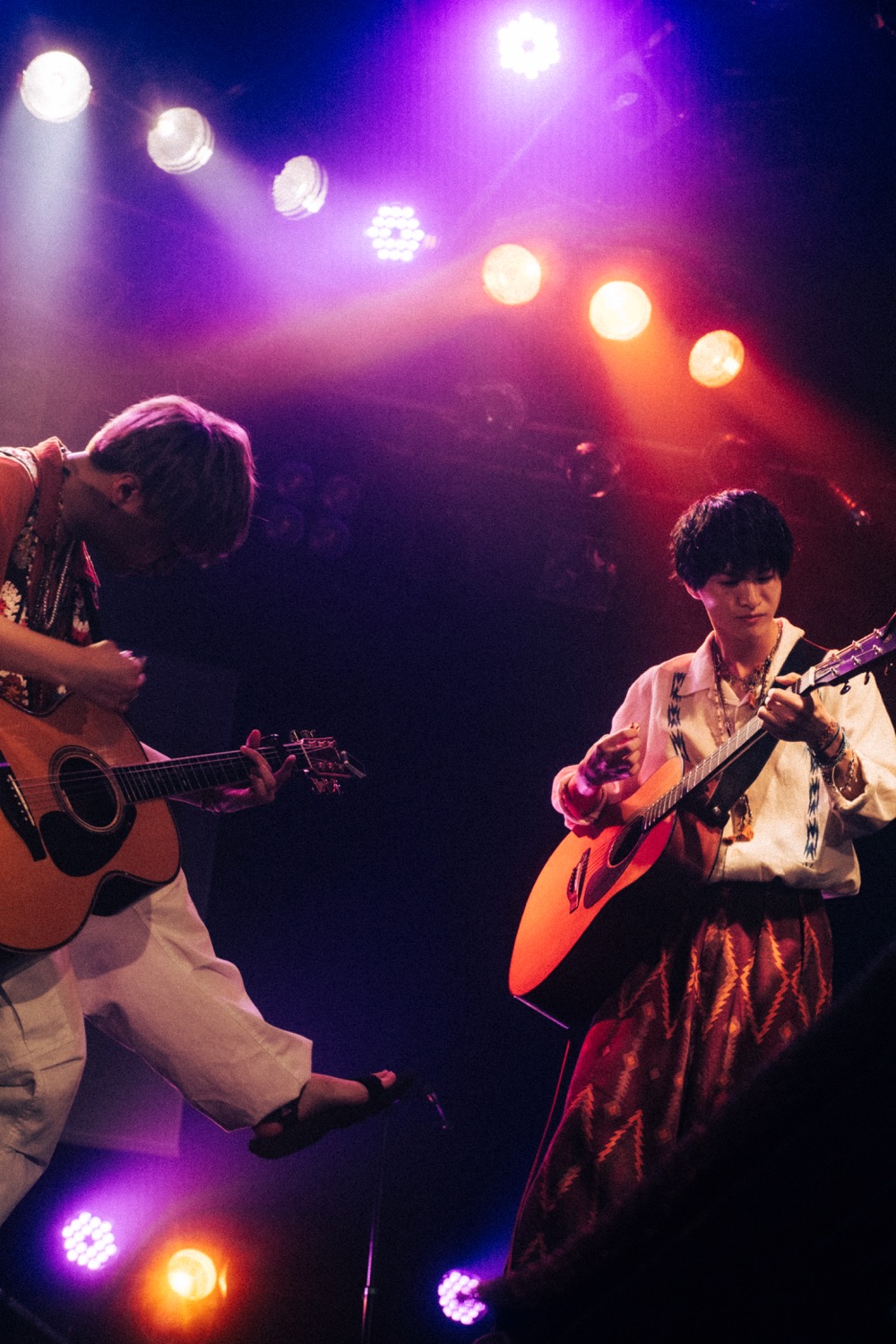 本公演のオープニングを飾ったのは、2019年の夏のライブハウスツアーに向けてふたりで作った「青春の唄」。ステージ上で向き合い、目を見つめあってストロークを重ねたふたりは、歌とアコギに情熱を思い切りぶつけ、冒頭から観客のクラップを自然と引き出すと、恋と青春の煌めきを収めたアップテンポのナンバーを続けて会場を沸かせた。
