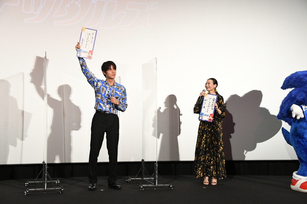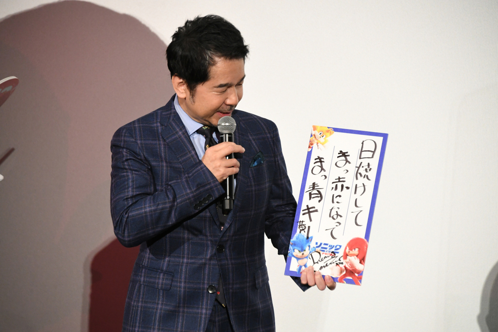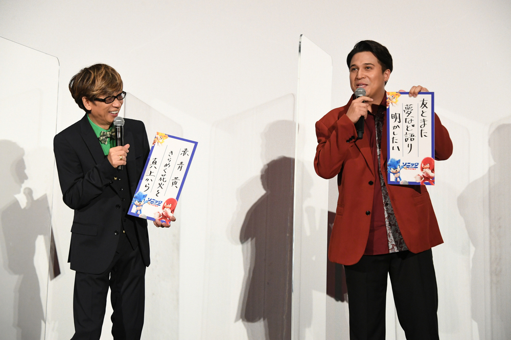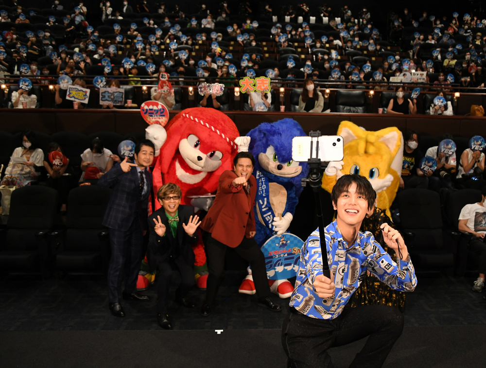 全米公開からおよそ4ヵ月、遂に満を持して日本公開を迎え、全国226館、254スクリーンでスタートした本作を祝して、豪華吹替キャスト陣が集結。ソニック、テイルス、ナックルズも特製巨大うちわを持っての“お祭り仕様”で駆け付けた。
