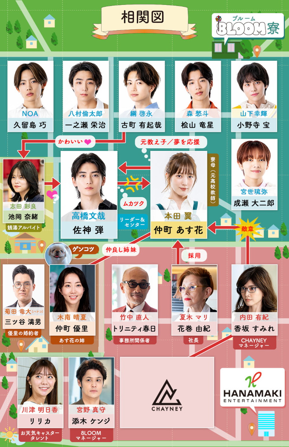 主人公・仲町あす花(なかまち・あすか)を演じる本田翼、あす花の元教え子で7人組ボーイズグループ“8LOOM(ブルーム)”のリーダー・佐神弾(さがみ・だん)役で高橋文哉、8LOOMメンバーである成瀬大二郎(なるせ・だいじろう)役で宮世琉弥、古町有起哉(ふるまち・ゆきや)役で綱啓永、一之瀬栄治(いちのせ・えいじ)役で八村倫太郎、桧山竜星(ひやま・りゅうせい)役で森愁斗、久留島巧(くるしま・たくみ)役でNOA、小野寺宝(おのでら・たから)役で山下幸輝が出演。