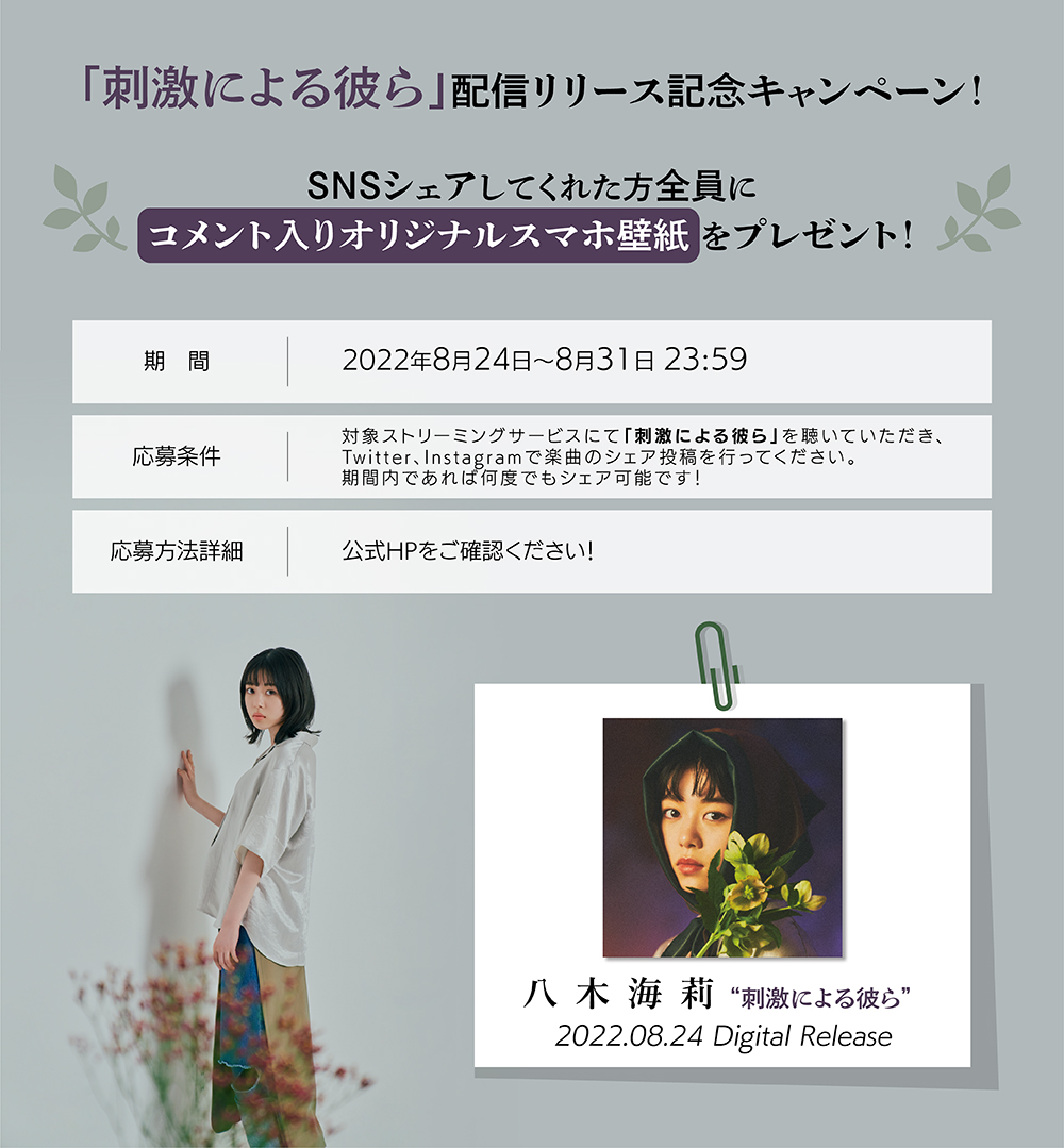 そして、対象のストリーミングサービスより「刺激による彼ら」を聴いて、Twitterにハッシュタグ「#八木海莉」「#刺激による彼ら」をつけ8月24日17時から8月31日23時59分までにTwitterもしくはInstagramにてシェアし、応募した人全員へ「コメント入りオリジナルスマホ壁紙」が贈呈される。詳細はオフィシャルサイトで。