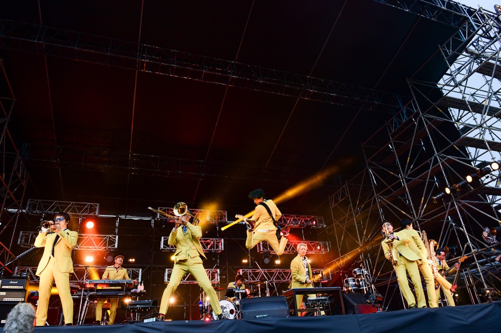 1曲目の「TONGUES OF FIRE」から激しいプレイが展開。大森はじめ(Percussion)がステージセンターでオーディエンスにハンドクラップを促すと会場中からハンドクラップが鳴り響き、スカパラのステージを後押ししていた。「Hurry Up!!」ではメンバーがステージ中を駆け巡りながら演奏し、北原雅彦はトロンボーンから大型の金管楽器であるスーザホンに持ち替えたにも関わらず、ステージ上を動きまわる。日本のフェスアンセムと言っても過言ではない「DOWN BEAT STOMP」まで、冒頭3曲で会場のボルテージを一気に上昇させた。