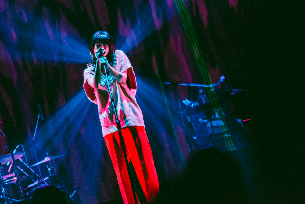 今回のツアー中に発表された最新シングル「初恋が泣いている」を披露すると、ここからは映像演出を使用。円形の枠内にメンバーが映し出された「ユラユラ」に続いては、ドラムとパーカッションのスリリングなセッションから「鯉」に突入して、カラフルな映像がアッパーな曲調をさらに盛り上げる。